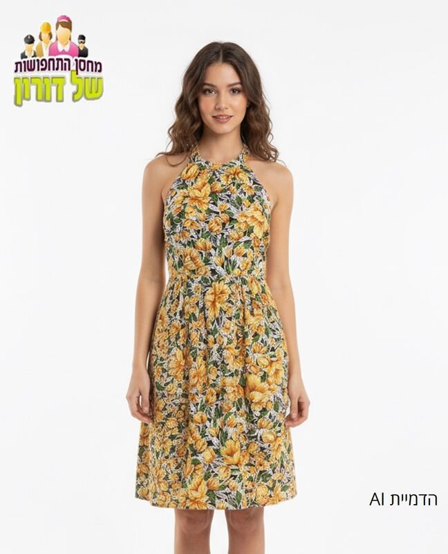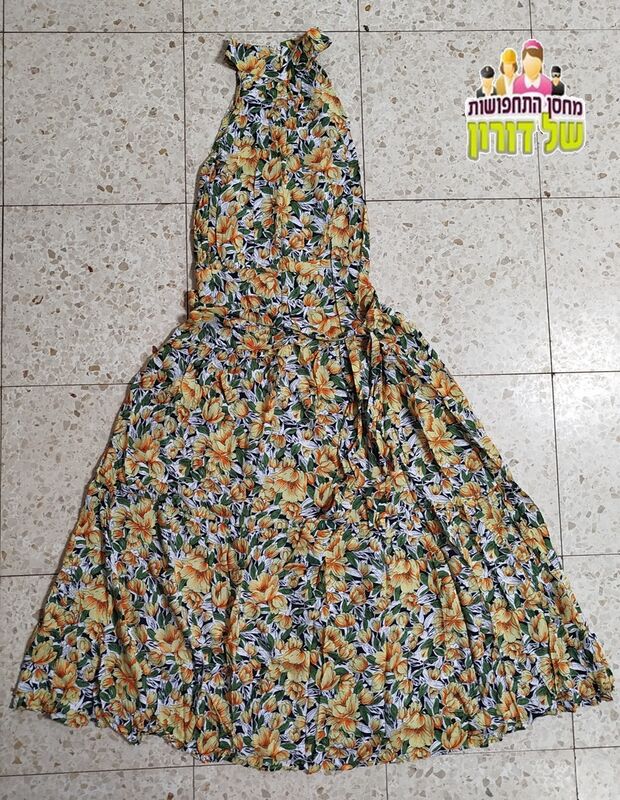שמלה קלילה ומחמיאה עם הדפס פרחים גדול בצבעי צהוב–כתום, ירוק ולבן. גזרת הלטר (קולר) נקשרת מאחורי הצוואר ומשאירה את הכתפיים חשופות, בשילוב חצאית ארוכה ונשפכת בסגנון בוהמייני. מתאימה לשנות ה 60-70 לאווירת רטרו צבעונית ושמחה.